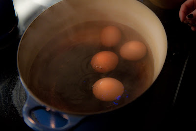 Boiled eggs are a seemingly easy thing to make but when done poorly they can have a dark green discolored coating on the yolk and the smell of sulfur. I love a well done egg, but really cannot stomach them when they are not properly cooked. There are many ways of boiling an egg, this method comes from Jacques Pepin's series "Fast food my way".