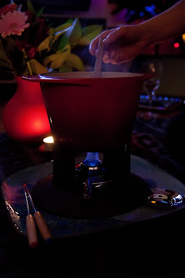 Rub the inside of the fondue pot with the garlic clove - add clove to pot or disgard
